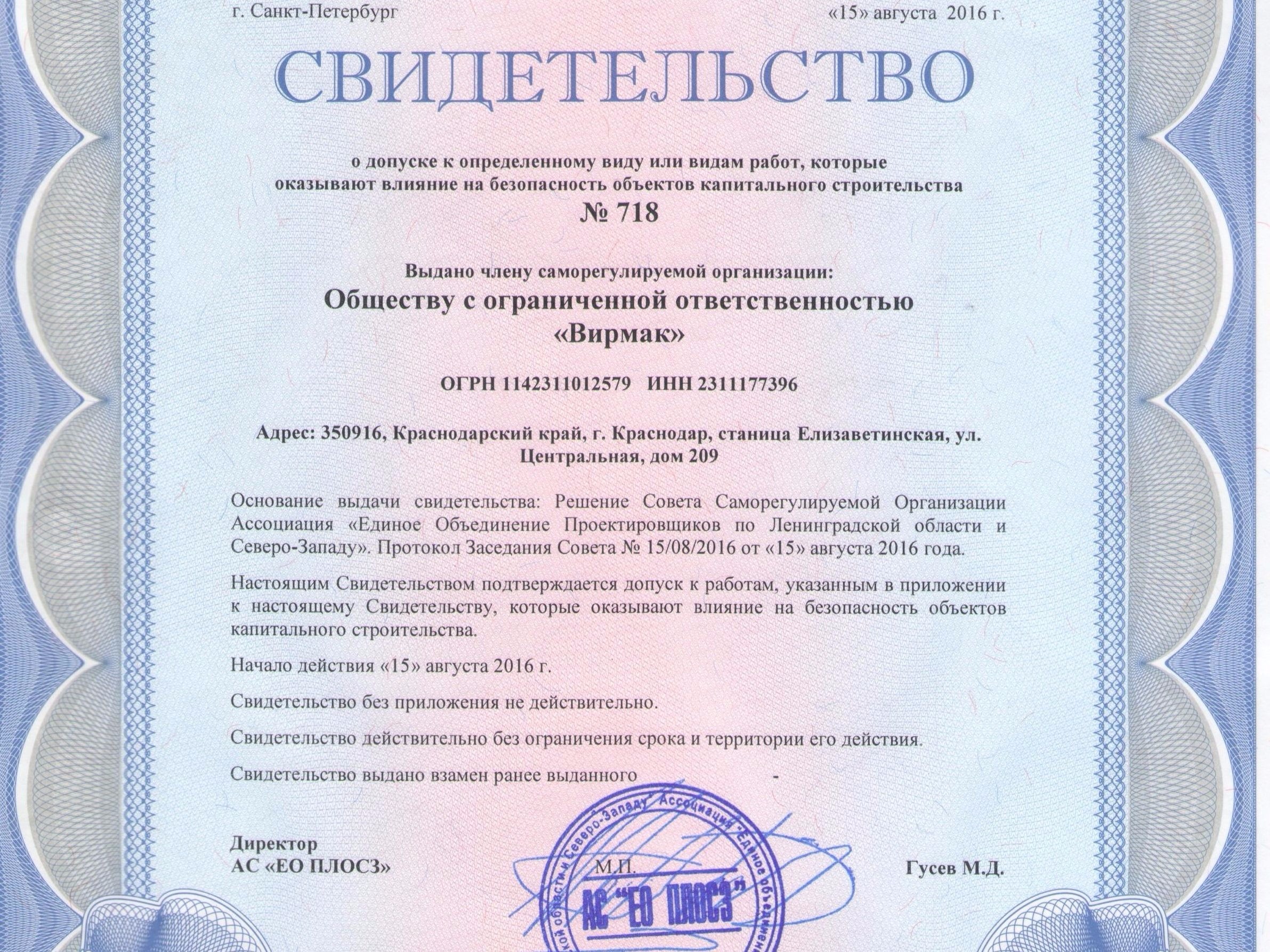 Вирмак. Свидетельство о допуске к определенному виду или видам работ, которые оказывают влияное на безопасность объектов капитального строительства