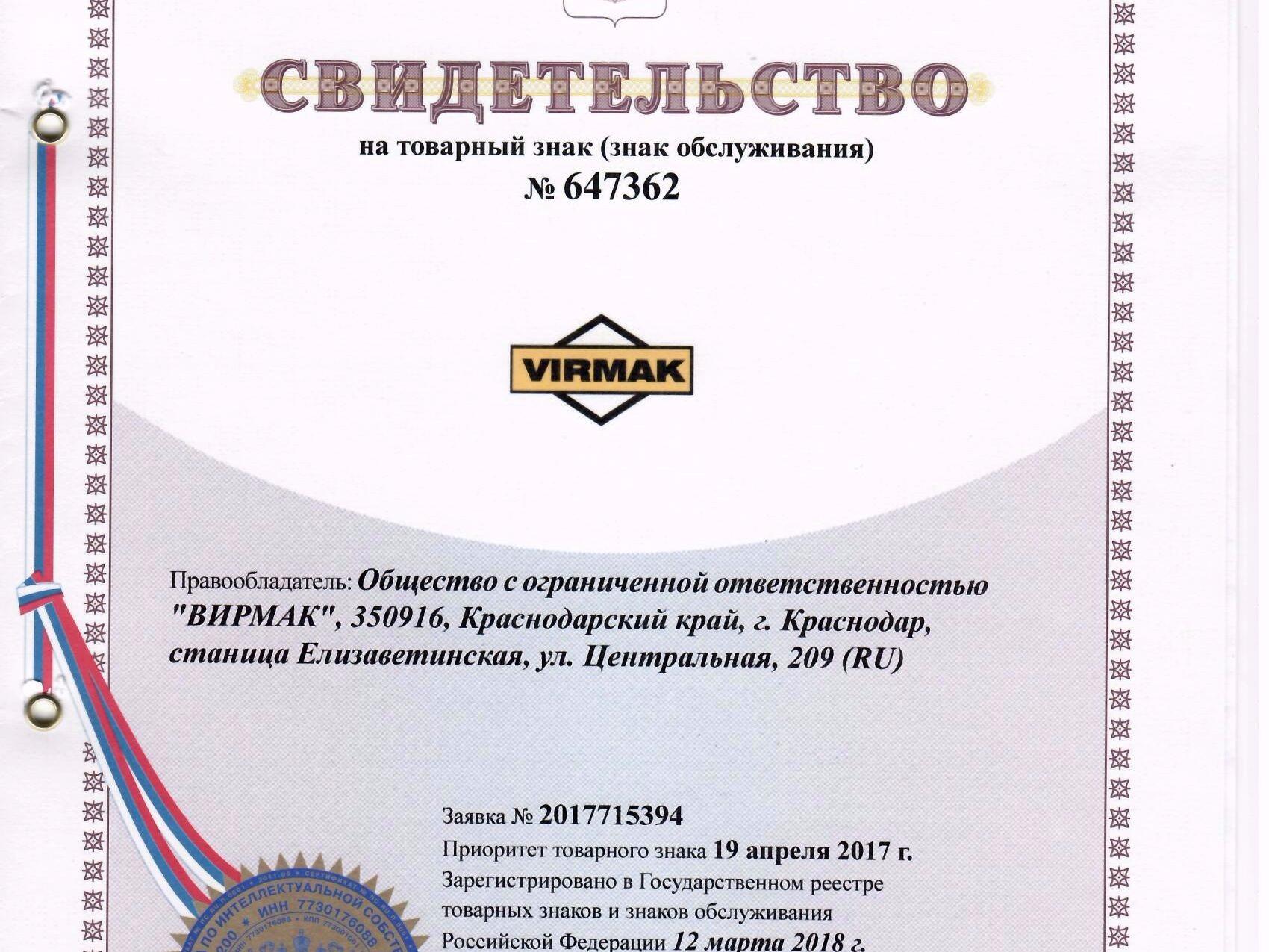19 апреля 2017 года компания ВИРМАК получила свидетельство на товарный знак.