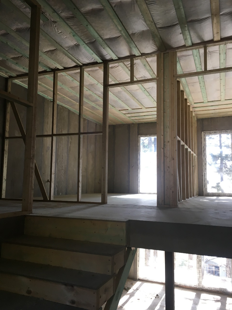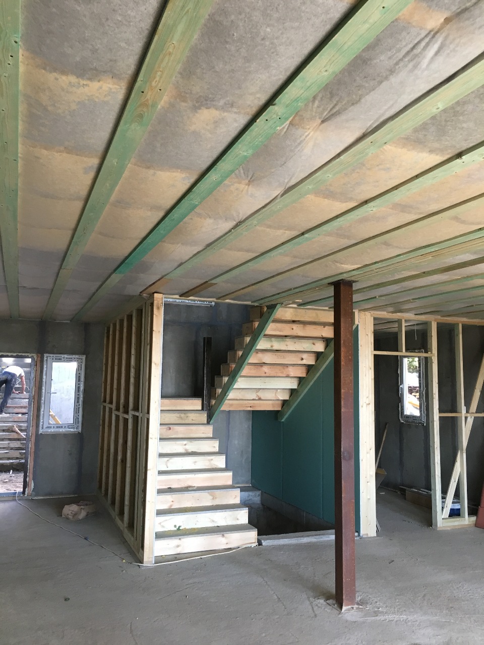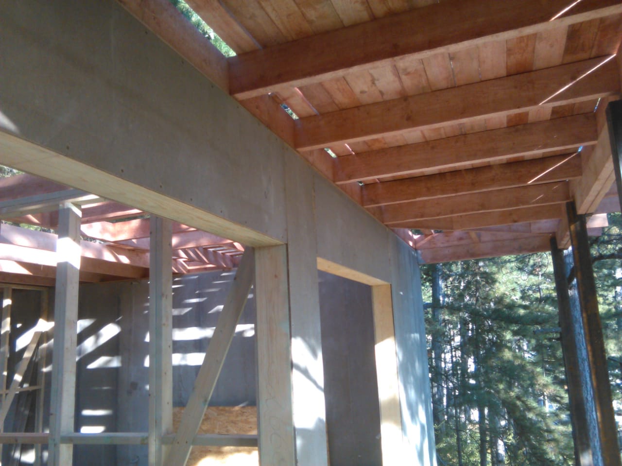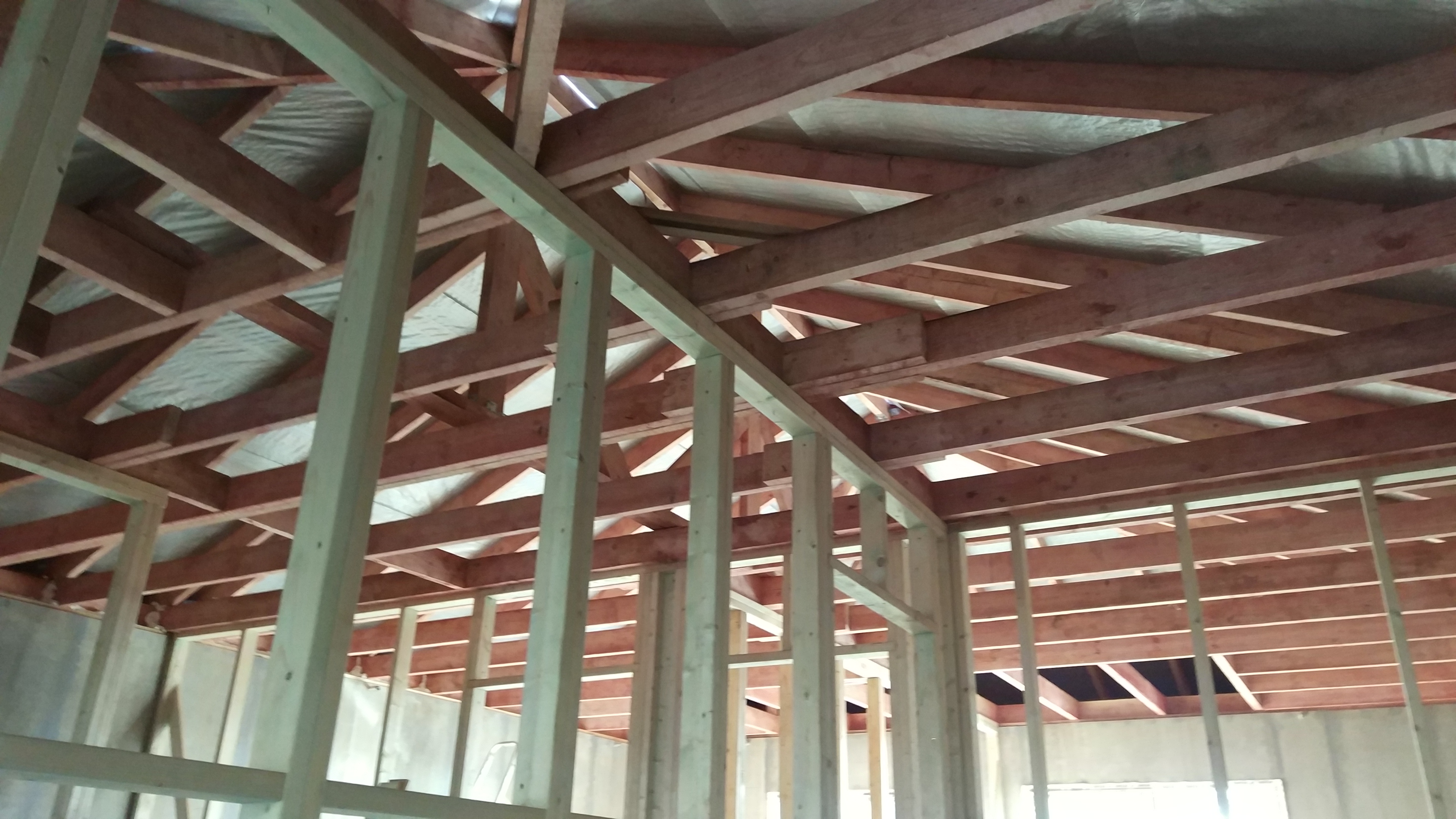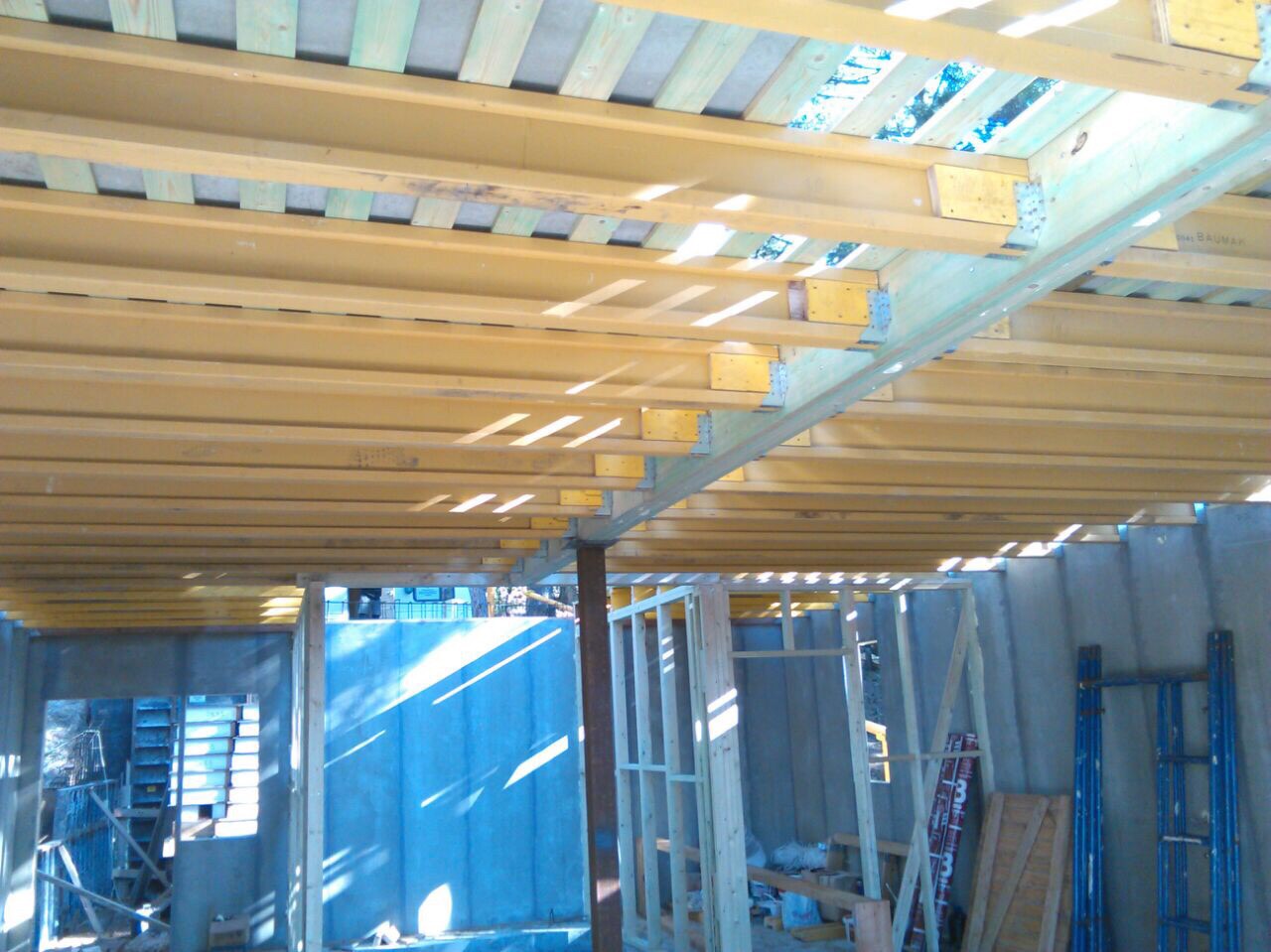 В межэтажных перекрытиях в качестве несущих лаг мы применяем двутавровые балки собственного производства с влагостойкой 24 мм. фанерой в сердечнике.