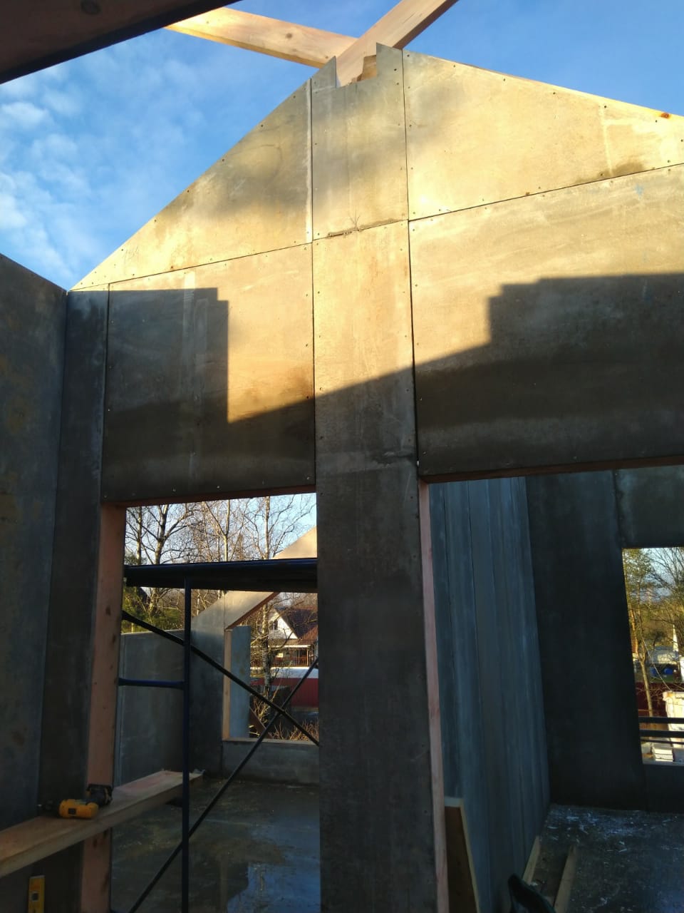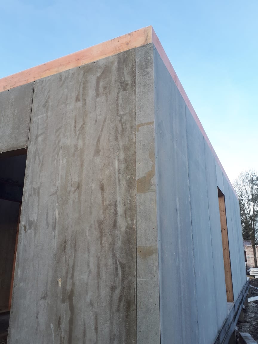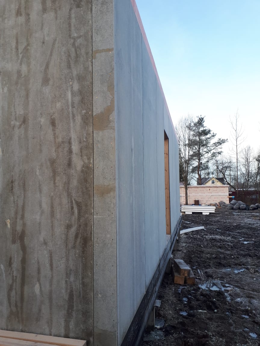 Все стены, как внешние, так и внутренние выполнены из СИП панелей с ЦСП высотой 3,0 м, поэтому стены 1-го этажа имеют высоту 3,0 м, а стены 2-го мансардного этажа от 1,5 м в нижней точке ската до 4,0 м в коньке.
