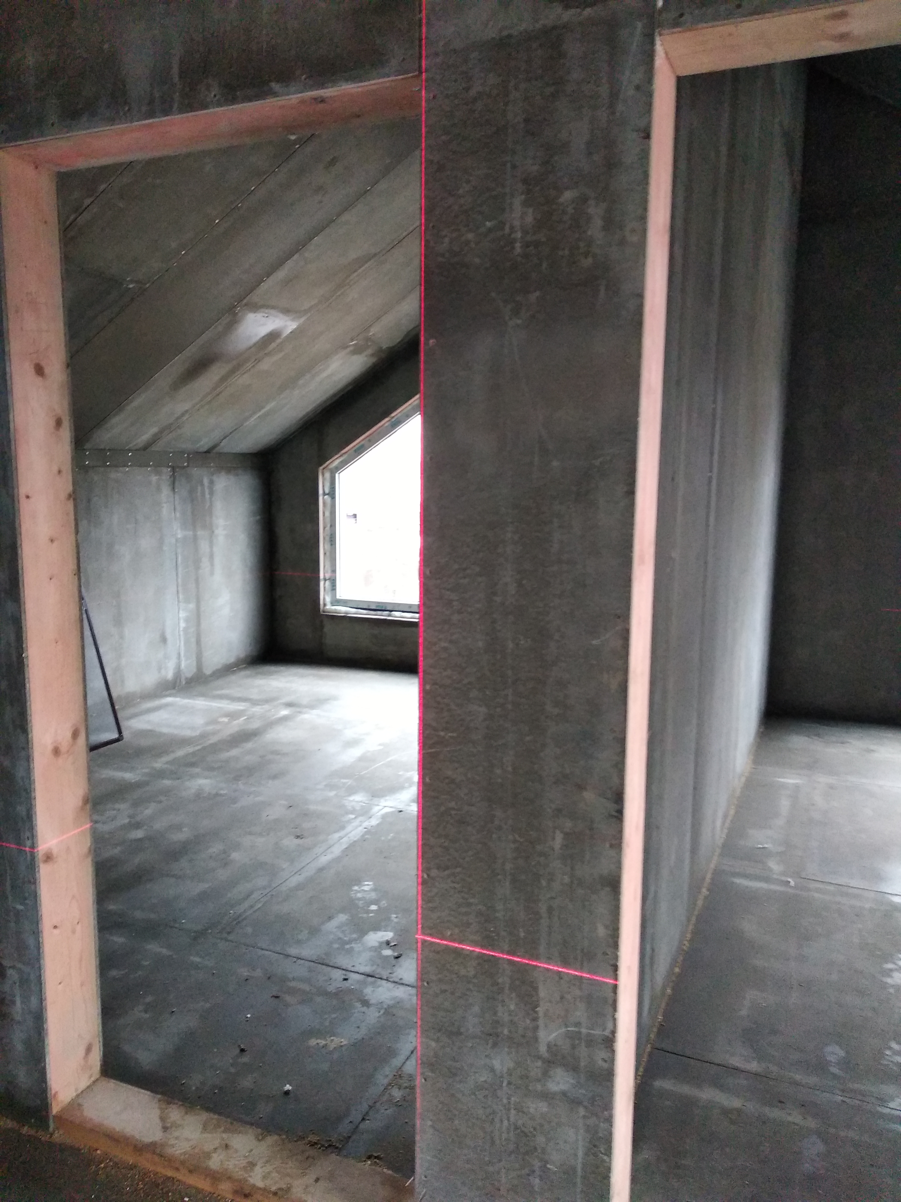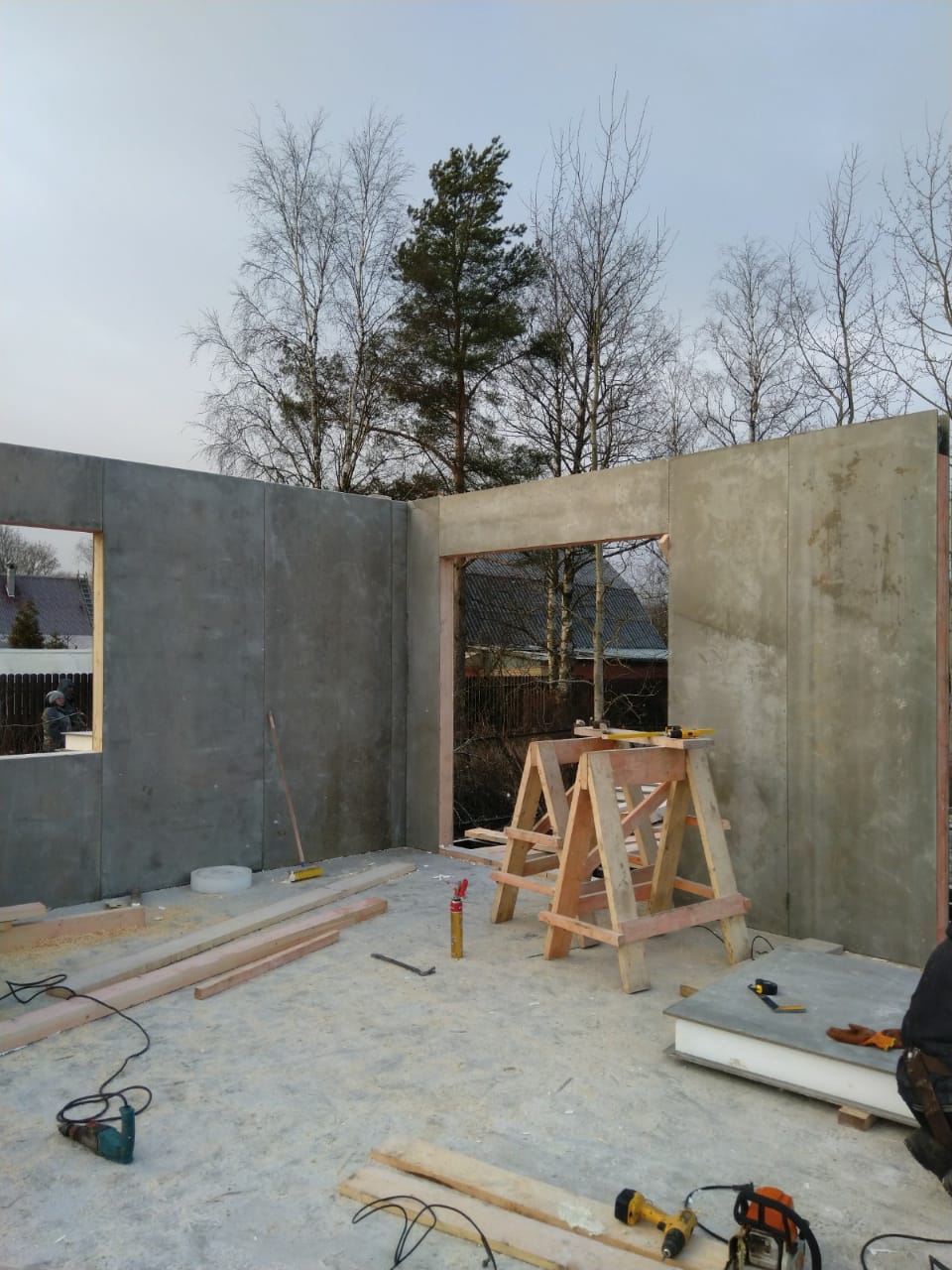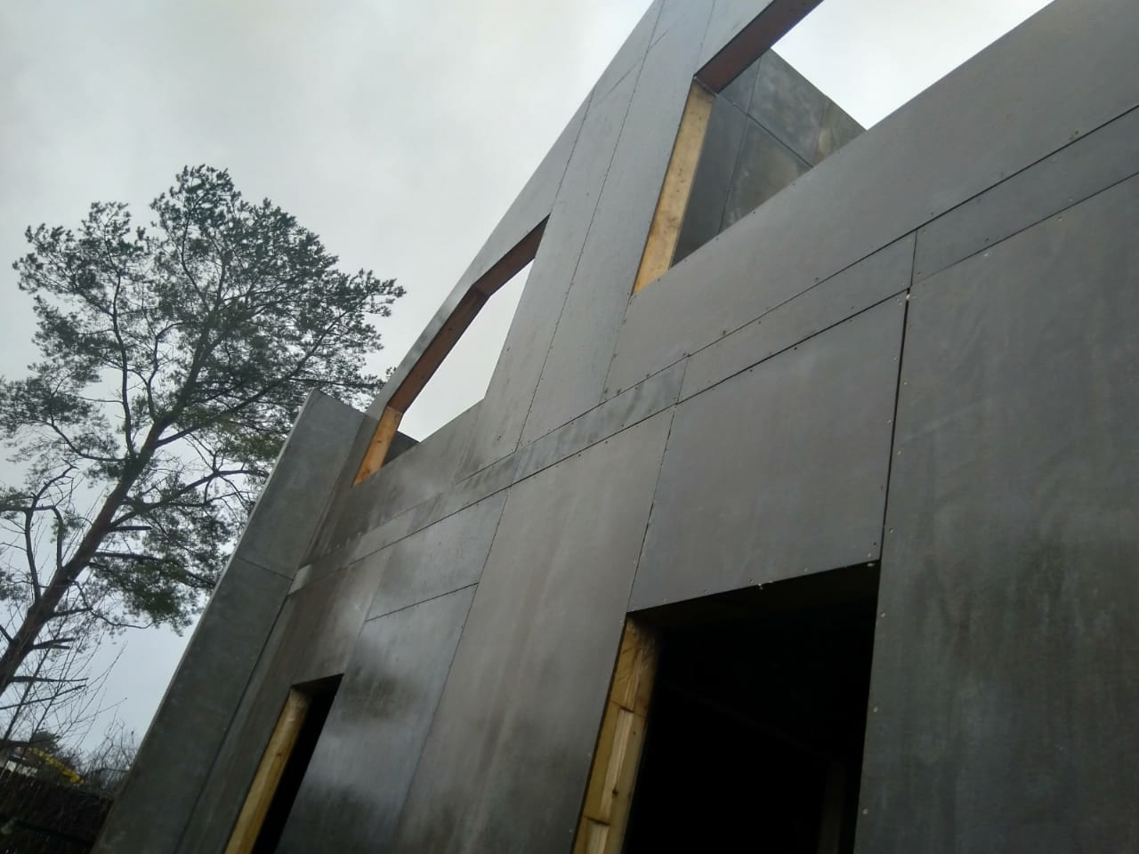 Все стены, как внешние, так и внутренние выполнены из СИП панелей с ЦСП высотой 3,0 м, поэтому стены 1-го этажа имеют высоту 3,0 м, а стены 2-го мансардного этажа от 1,5 м в нижней точке ската до 4,0 м в коньке.