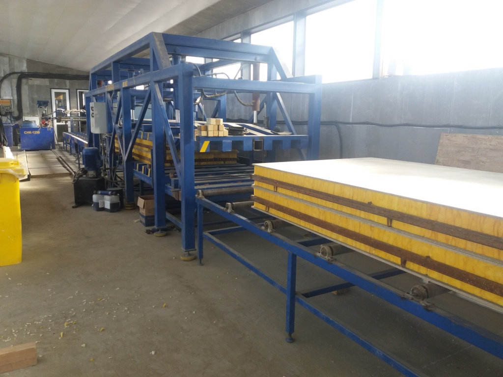 Готовый пирог – СИП, сэндвич панель по приводному рольгангу поступает в гидравлический пресс. В прессе Сип панель находится до полного отвердения и полимеризации клея. После чего готовую панель направляют на узел фрезерования, где с помощью фрезы выбирается паз для будущей обрусовки панели.