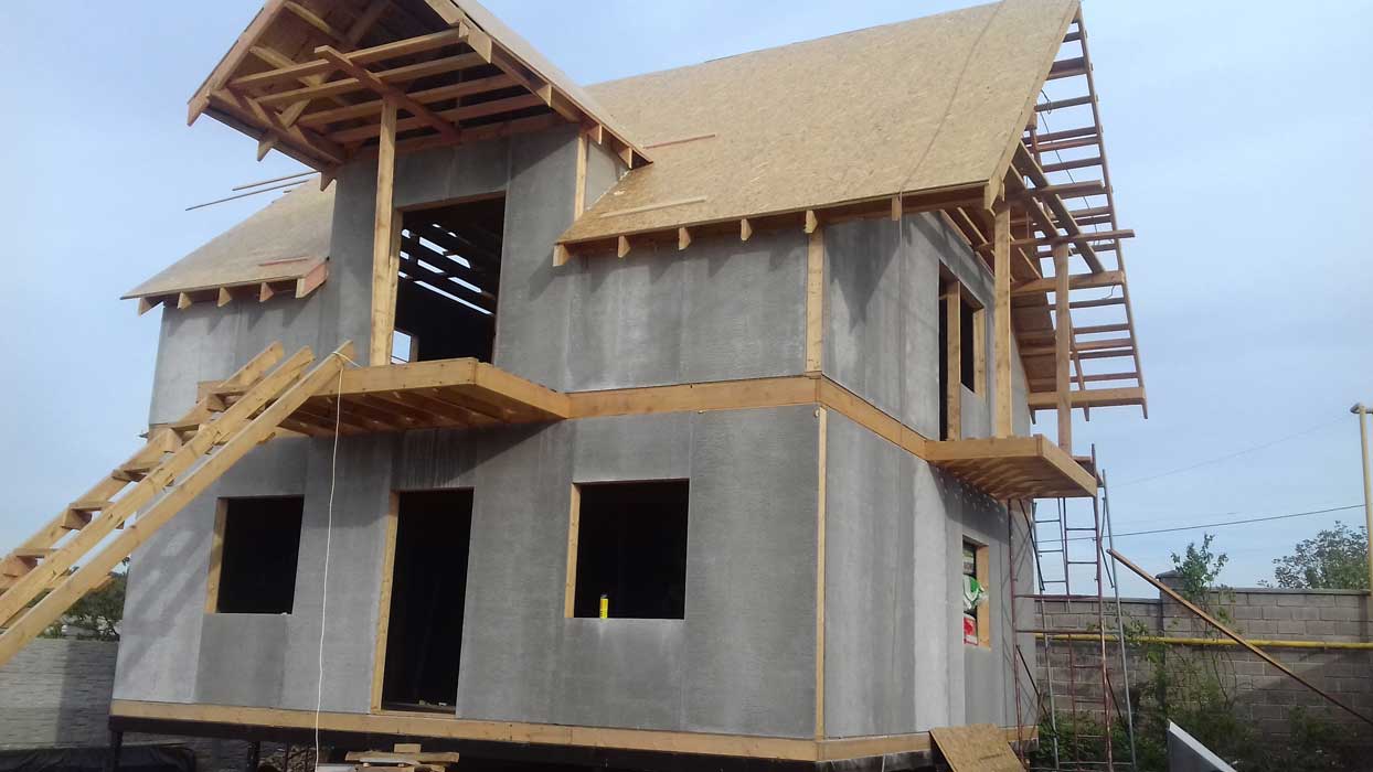 из СИП панелей из ЦСП размером 2700*1200*168 мм с антисептированным калиброванным пиломатериалом камерной сушки (46*140 мм). Монтаж каркасов несущих перегородок из пиломатериала 38*89 мм (76*89 мм).