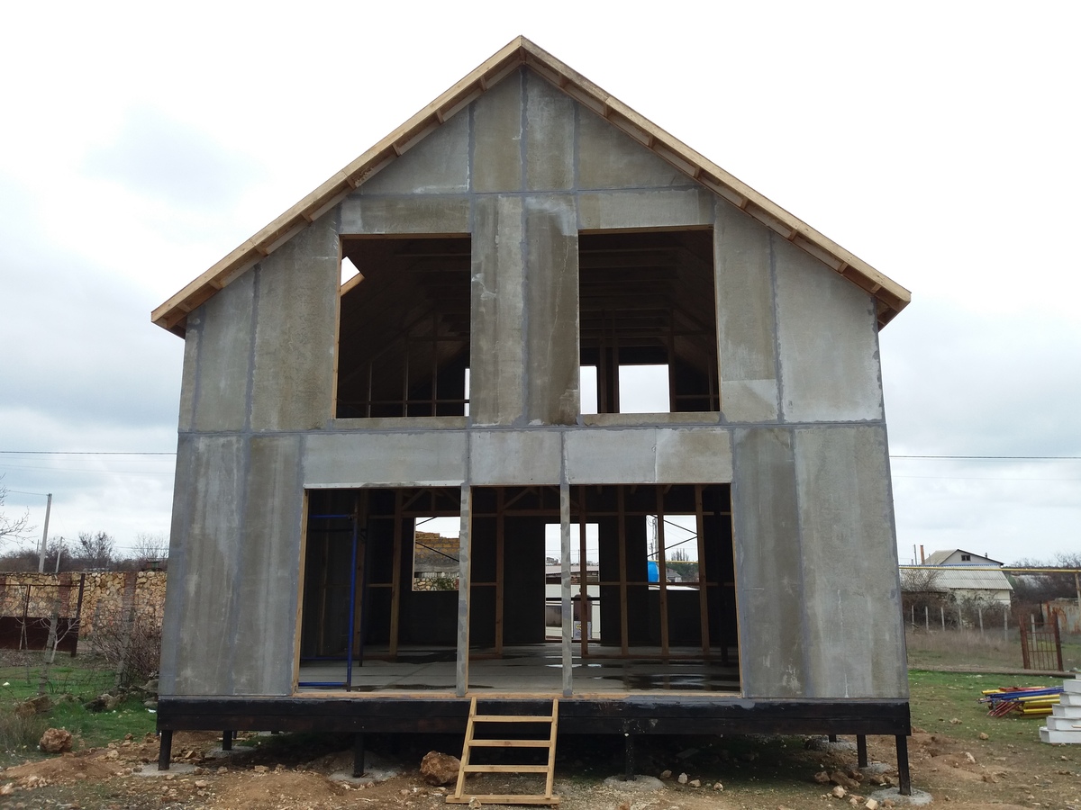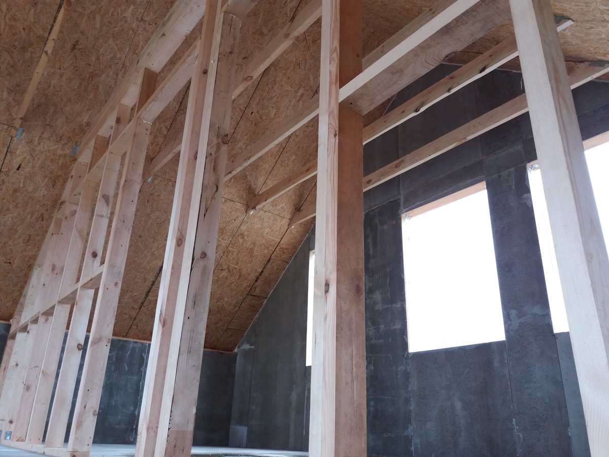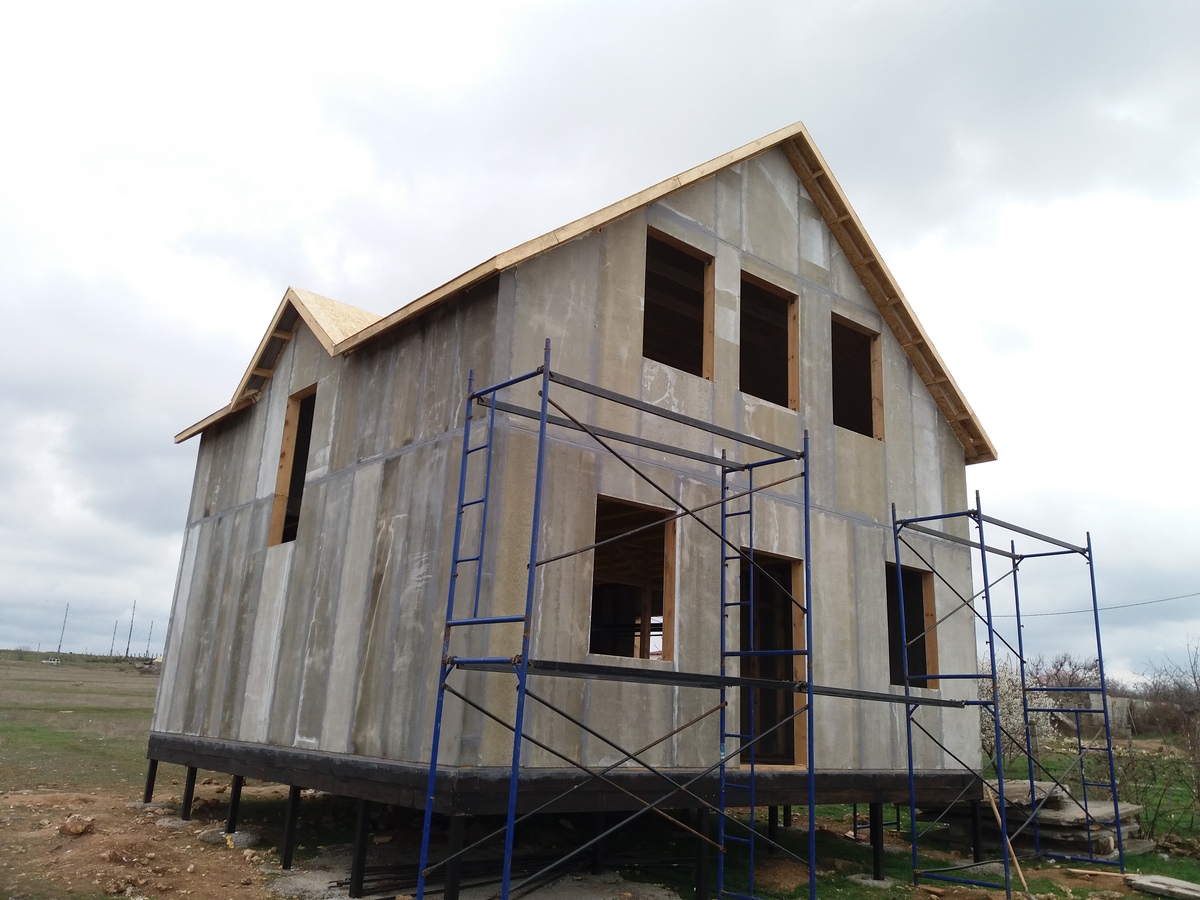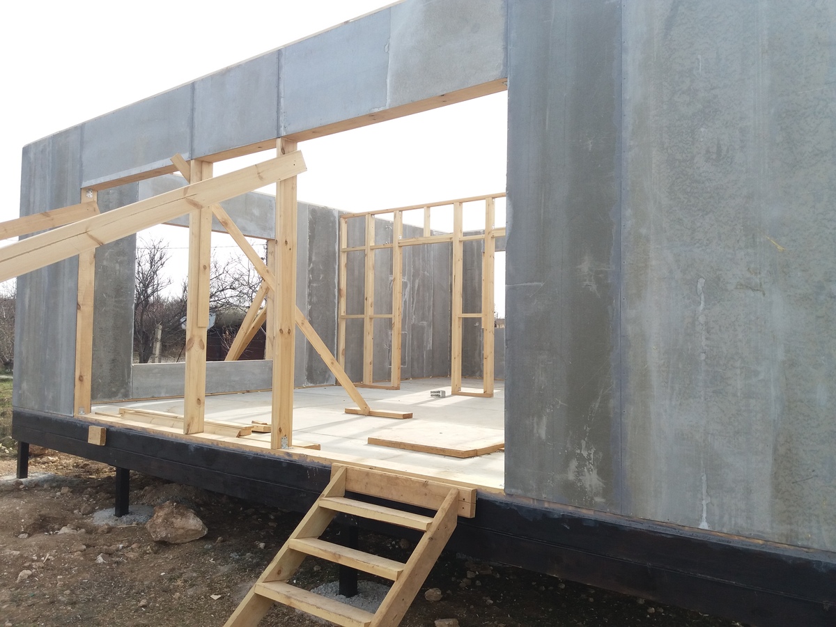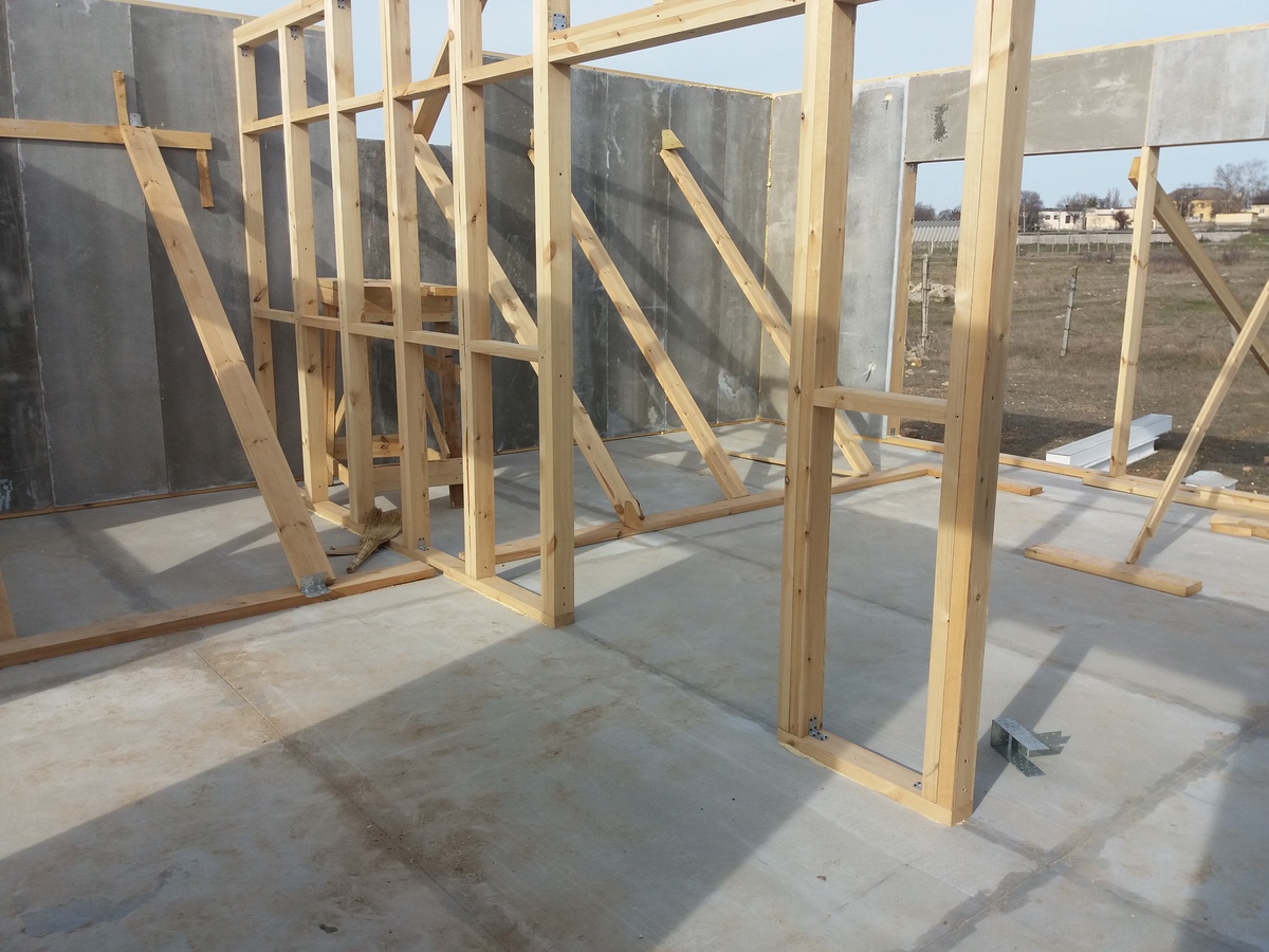 из СИП панелей из ЦСП размером 2700*1200*168 мм с антисептированным калиброванным пиломатериалом камерной сушки (46*140 мм). Монтаж каркасов несущих перегородок из пиломатериала 38*89 мм (76*89 мм).