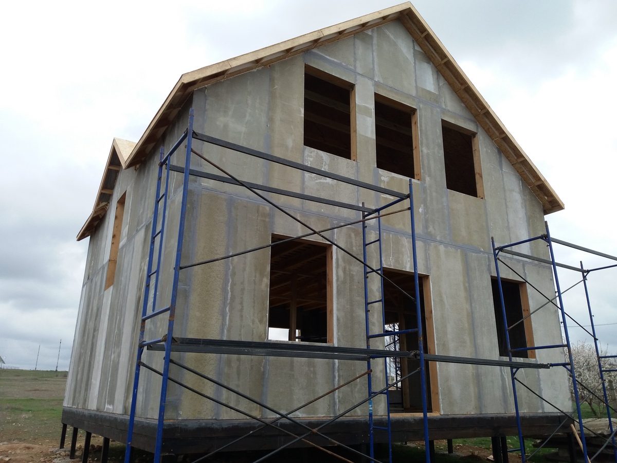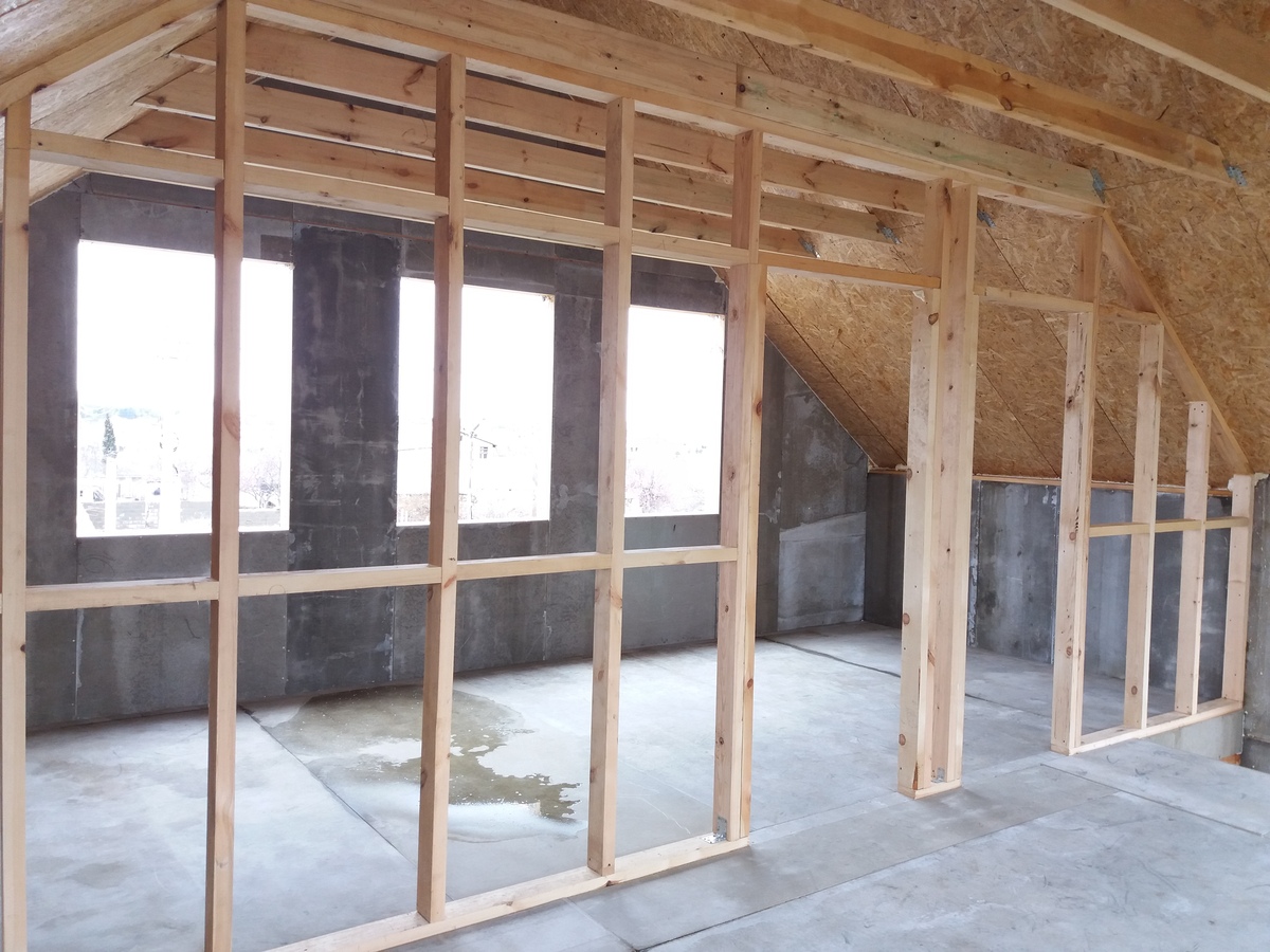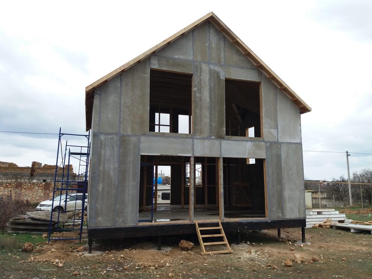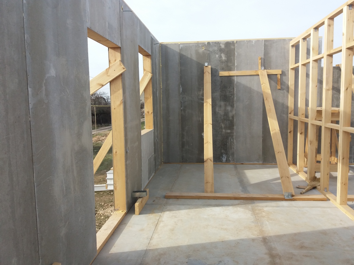 из СИП панелей из ЦСП размером 2700*1200*168 мм с антисептированным калиброванным пиломатериалом камерной сушки (46*140 мм). Монтаж каркасов несущих перегородок из пиломатериала 38*89 мм (76*89 мм).