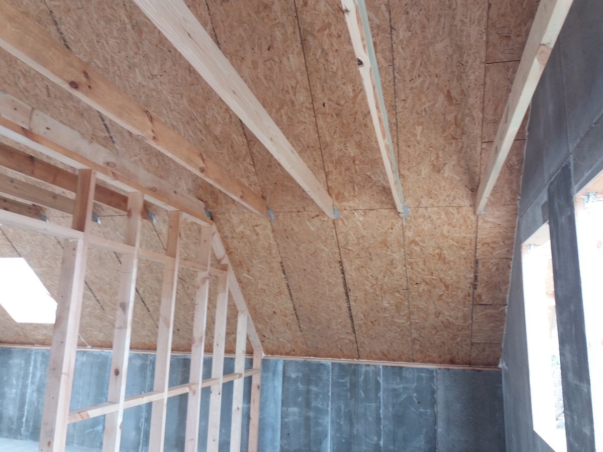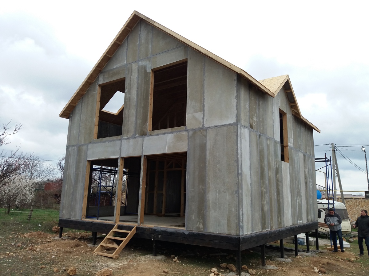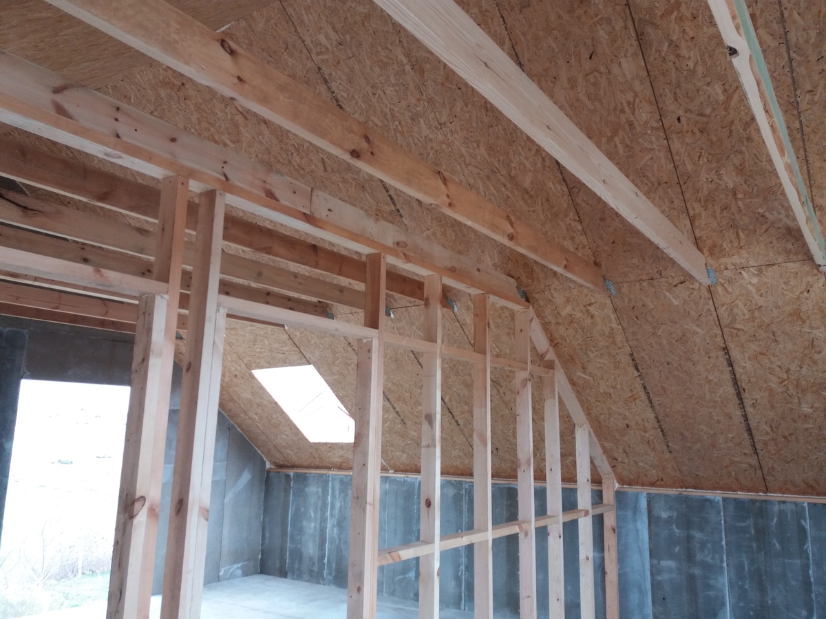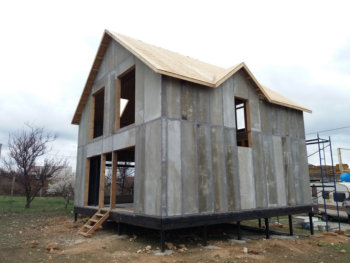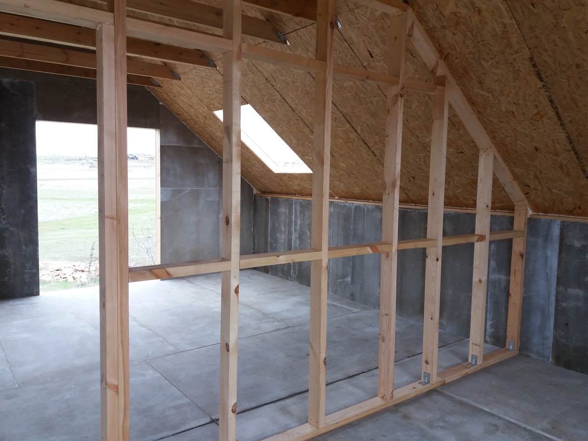 из СИП панелей из ЦСП размером 2700*1200*168 мм с антисептированным калиброванным пиломатериалом камерной сушки (46*140 мм). Монтаж каркасов несущих перегородок из пиломатериала 38*89 мм (76*89 мм).