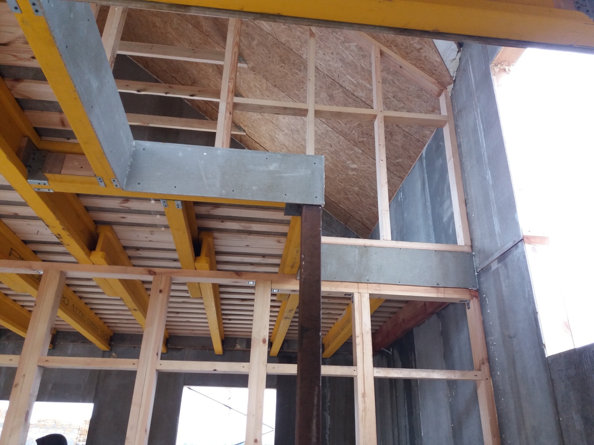 • Межэтажное перекрытие: Балки перекрытия БДК 250/300/350х65 мм, верхняя поперечная обрешетка 22х90 мм, сплошной настил листы ЦСП 12-16 мм. Звукоизоляция перекрытия. Пароизоляция перекрытия. Готовность пола и потолка под чистовую отделку.