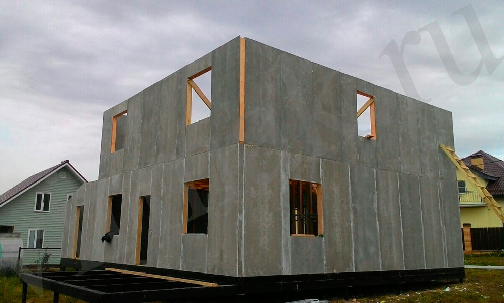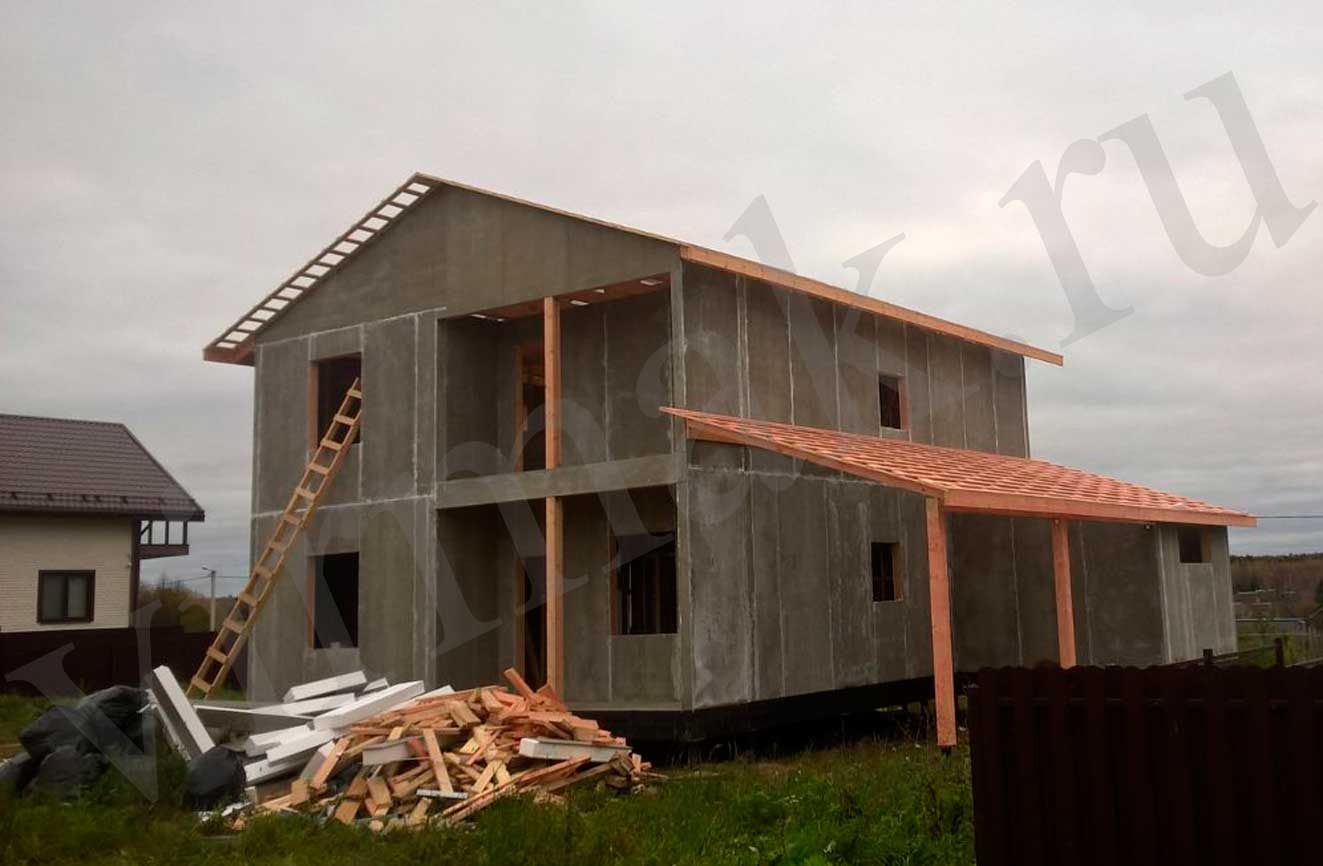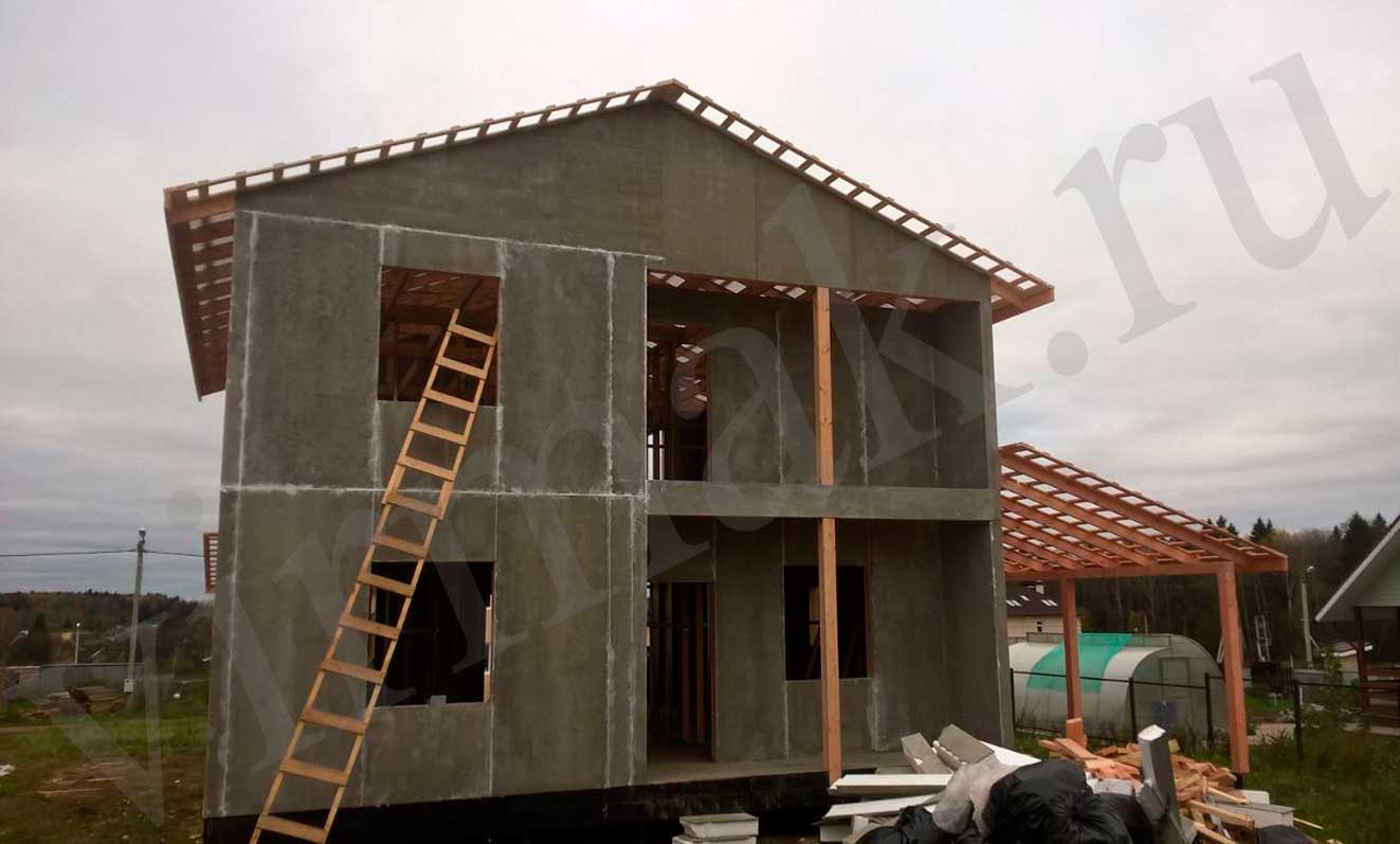 из СИП панелей из ЦСП размером 2700*1200*168 мм с антисептированным калиброванным пиломатериалом камерной сушки (46*140 мм). Монтаж каркасов несущих перегородок из пиломатериала 38*89 мм (76*89 мм).