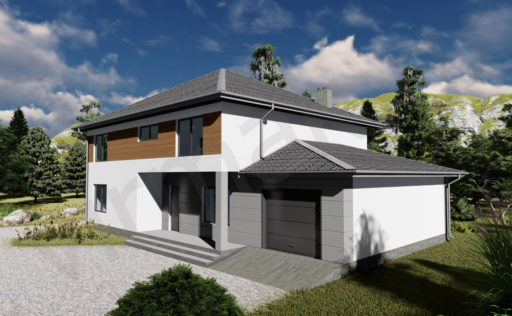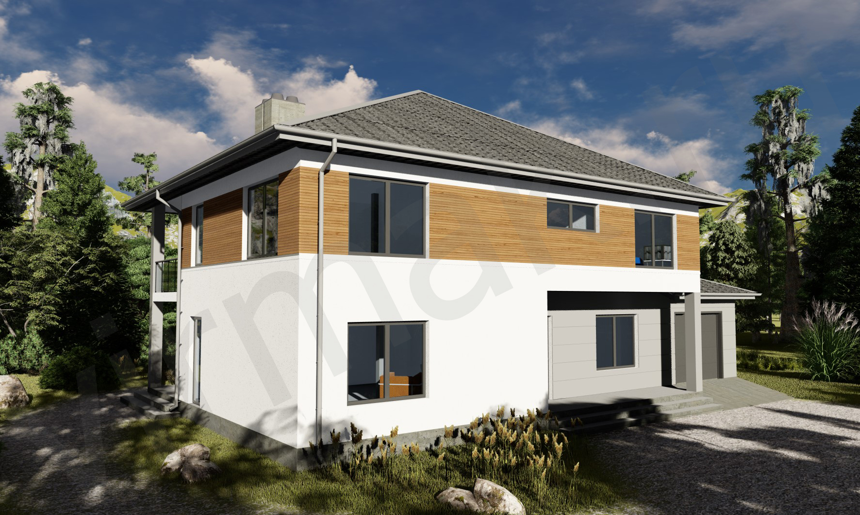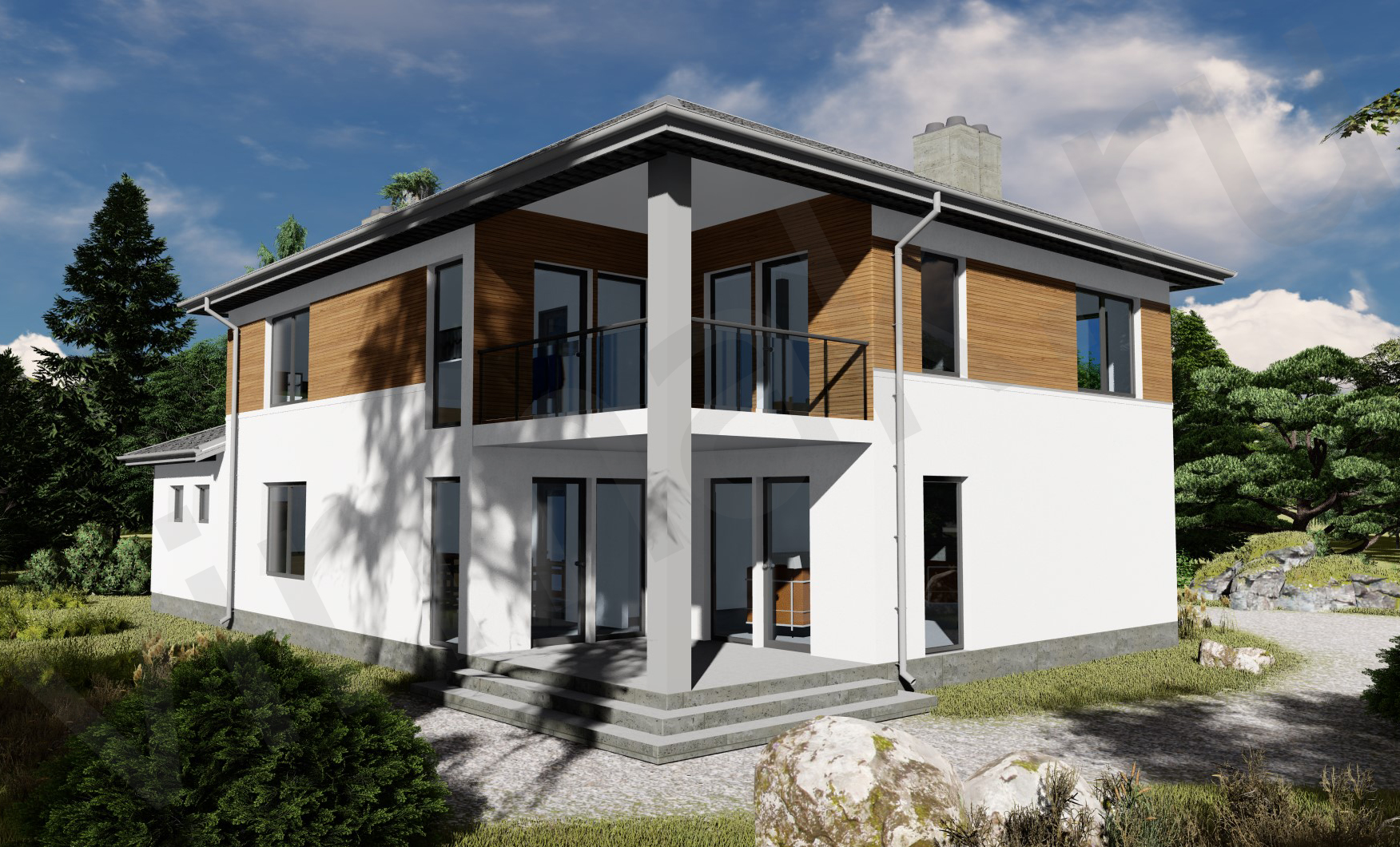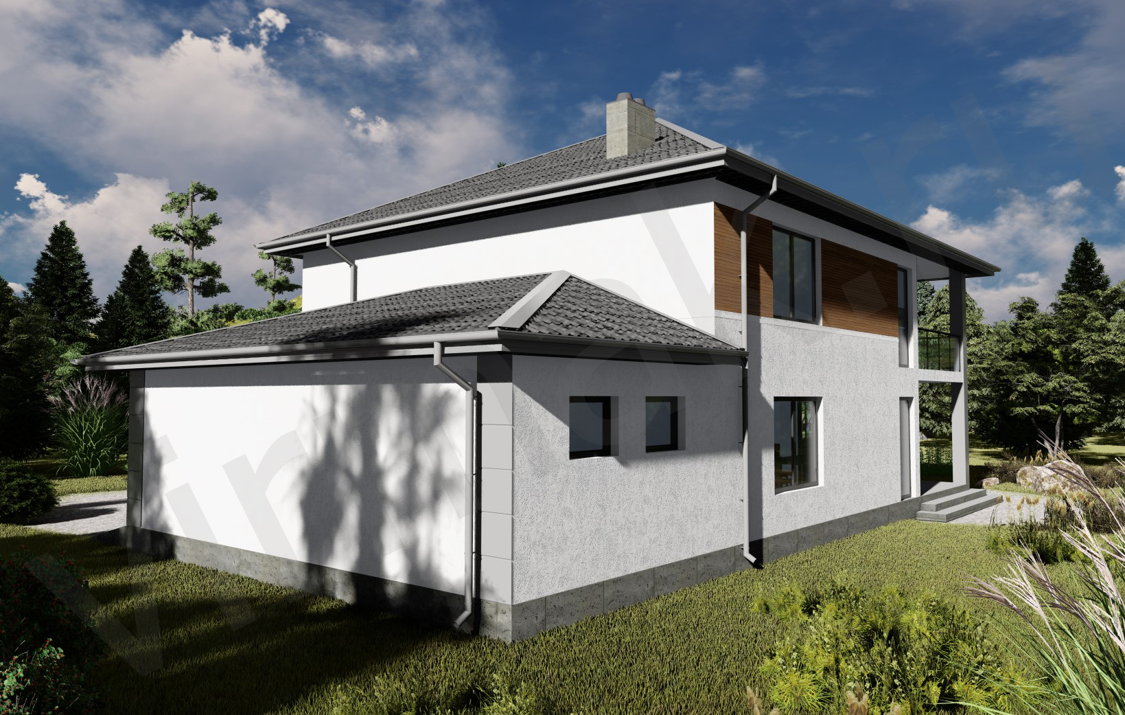 • Плоская или скатная утепленная кровля (пароизоляционная пленка, утеплитель вата на основе стекловолокна или базальта, гидро-ветрозащитная мембрана) с покрытием из металлочерепицы, полимерной мембраны или гибкой черепицы. (цена отличается от выбранного типа) (Ширина карнизного свеса от 30 см. Водосточная система в стоимость не входит