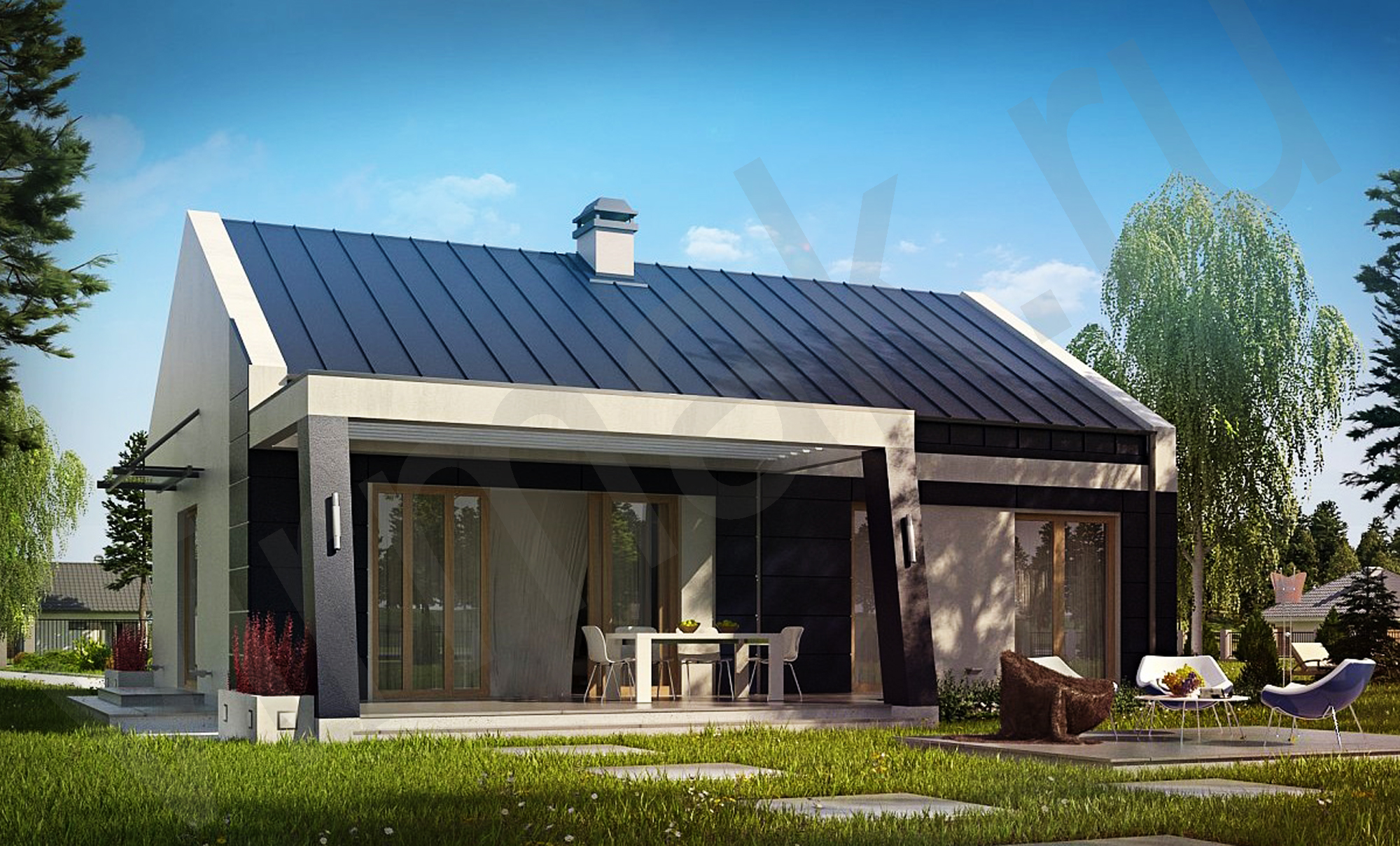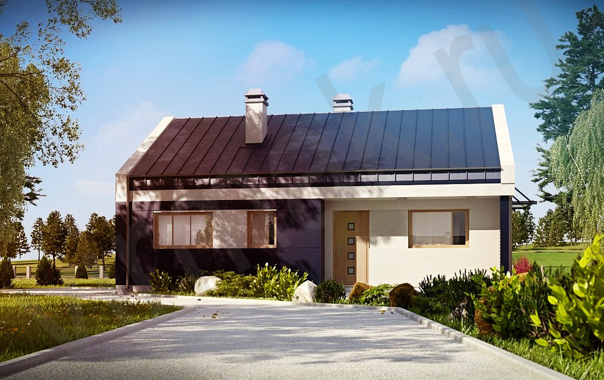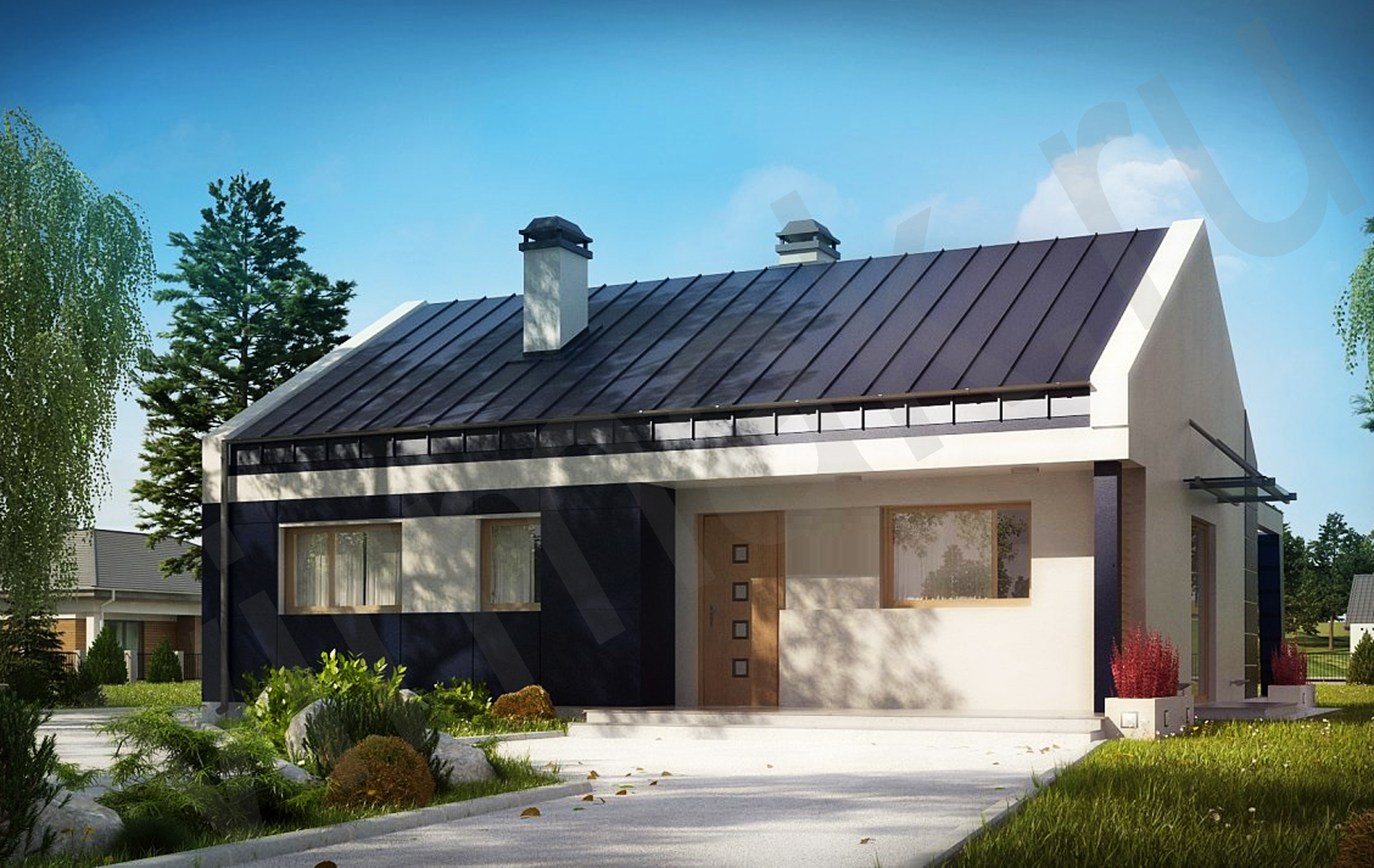 • Плоская или скатная утепленная кровля (пароизоляционная пленка, утеплитель вата на основе стекловолокна или базальта, гидро-ветрозащитная мембрана) с покрытием из металлочерепицы, полимерной мембраны или гибкой черепицы. (цена отличается от выбранного типа) (Ширина карнизного свеса от 30 см. Водосточная система в стоимость не входит