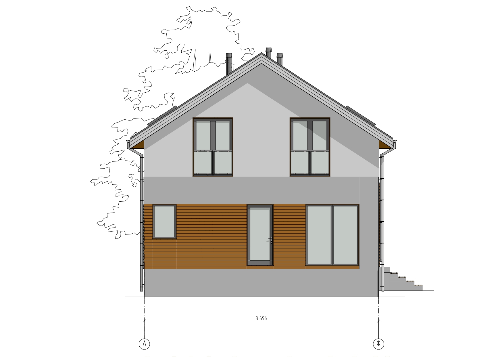 • Внешние стены — трехслойная СИП панель с ЦСП (h=2700 мм) толщиной 172 мм, утеплитель 148/198 мм на выбор: Пенополистирол или Изовер Сэндвич Лайф. Несущий каркас стен сухая калиброванная доска 46х145/195 мм.