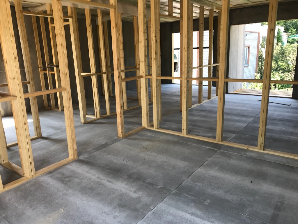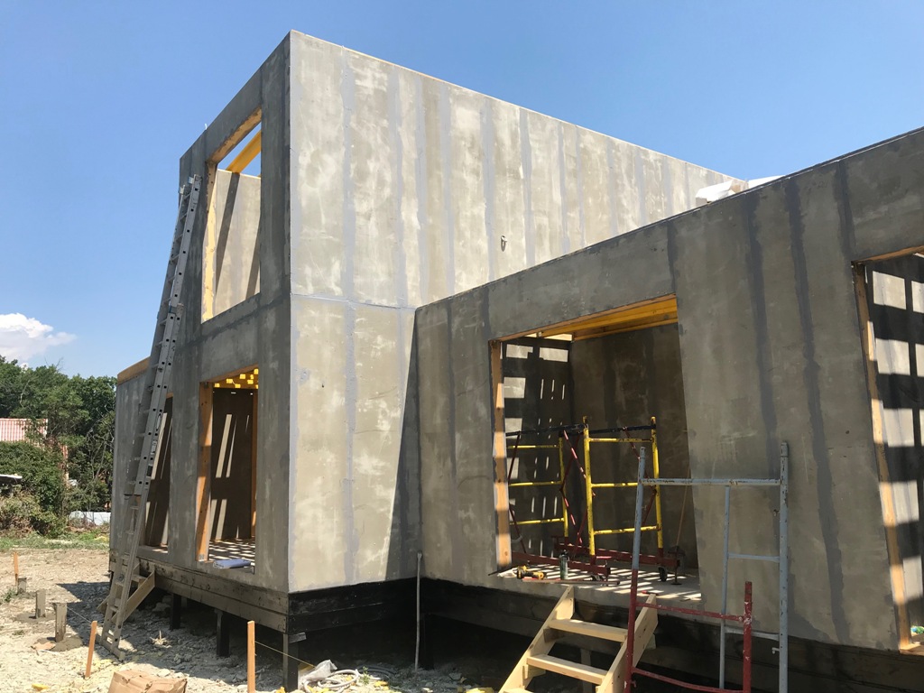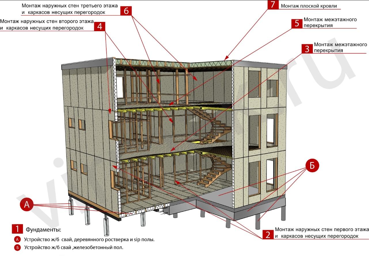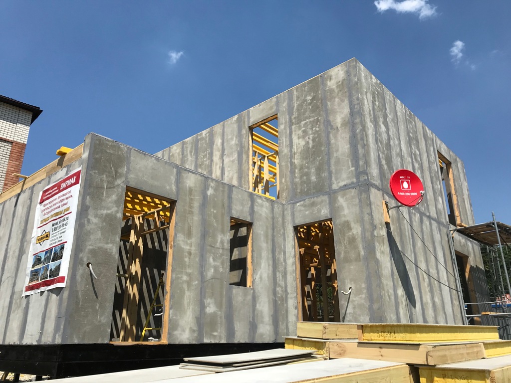 из СИП панелей из ЦСП размером 2700*1200*168 мм с антисептированным калиброванным пиломатериалом камерной сушки (46*140 мм). Монтаж каркасов несущих перегородок из пиломатериала 38*89 мм (76*89 мм).
