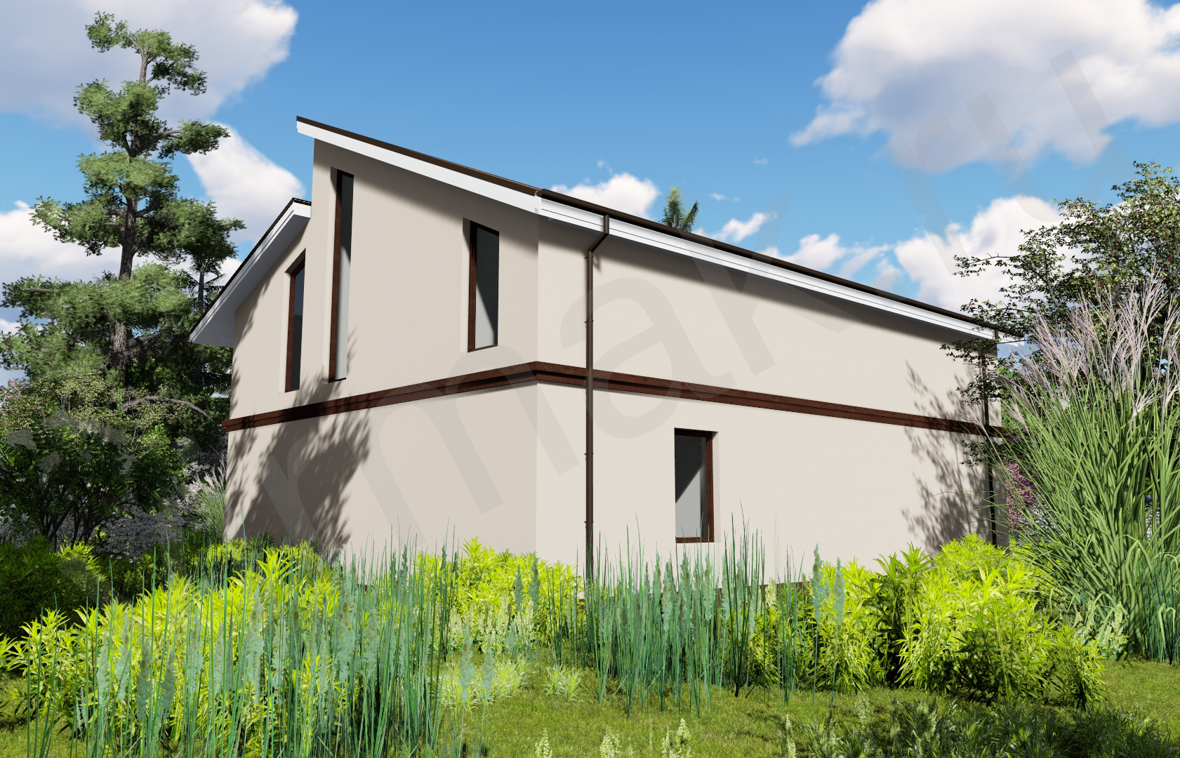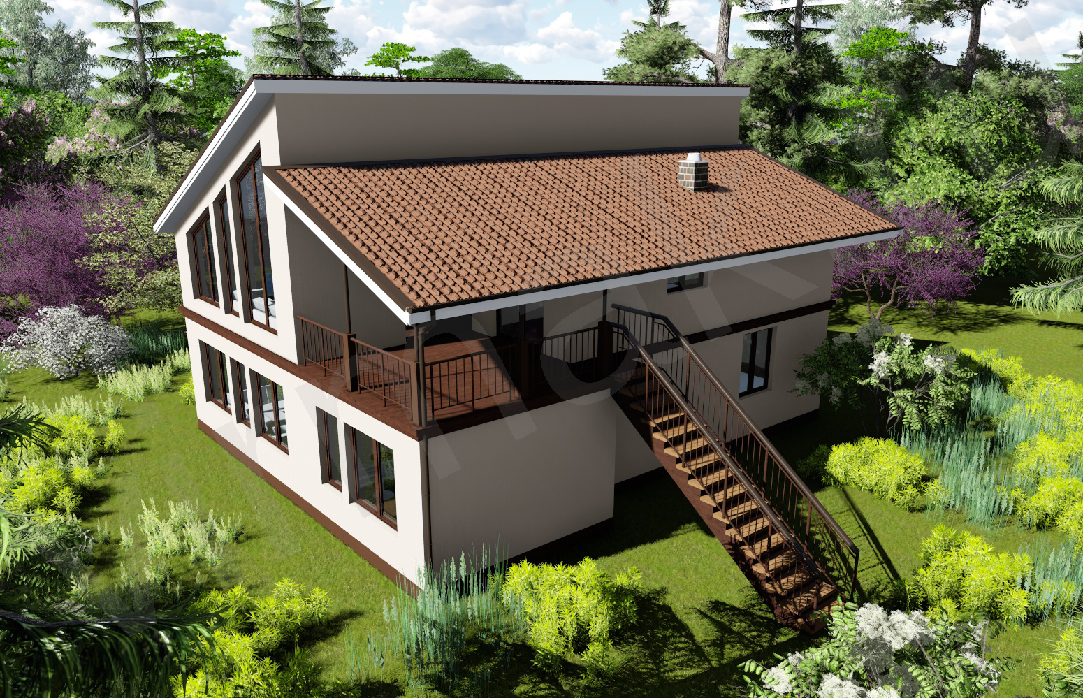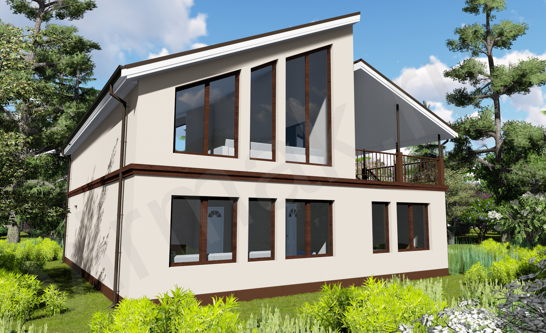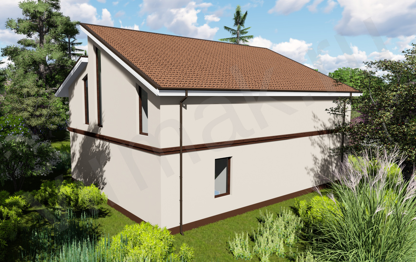 • Плоская или скатная утепленная кровля (пароизоляционная пленка, утеплитель вата на основе стекловолокна или базальта, гидро-ветрозащитная мембрана) с покрытием из металлочерепицы, полимерной мембраны или гибкой черепицы. (цена отличается от выбранного типа) (Ширина карнизного свеса от 30 см. Водосточная система в стоимость не входит