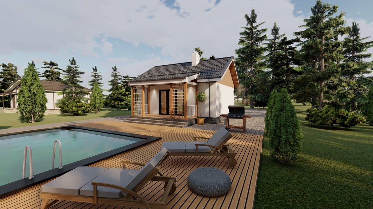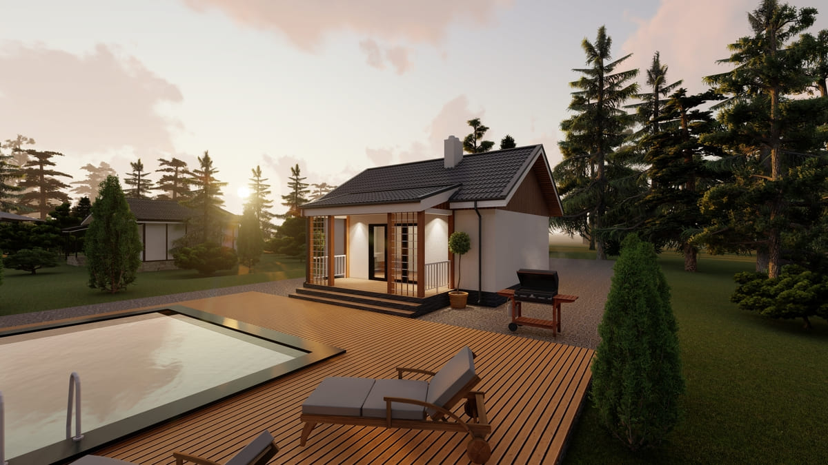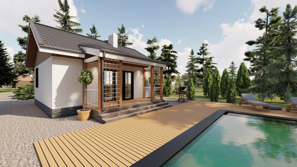 • Плоская или скатная утепленная кровля (пароизоляционная пленка, утеплитель вата на основе стекловолокна или базальта, гидро-ветрозащитная мембрана) с покрытием из металлочерепицы, полимерной мембраны или гибкой черепицы. (цена отличается от выбранного типа) (Ширина карнизного свеса от 30 см. Водосточная система в стоимость не входит