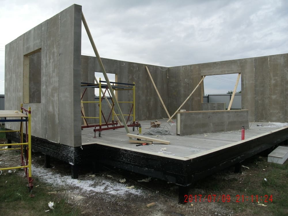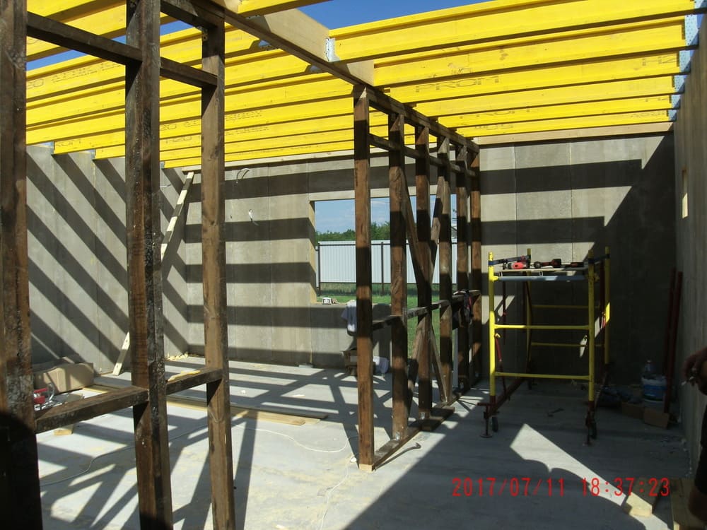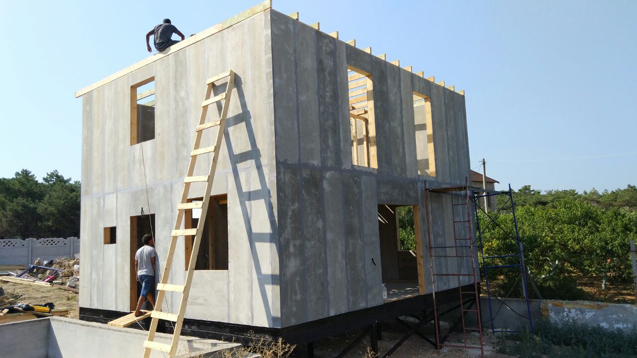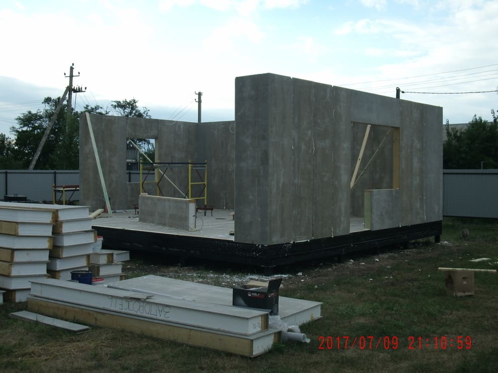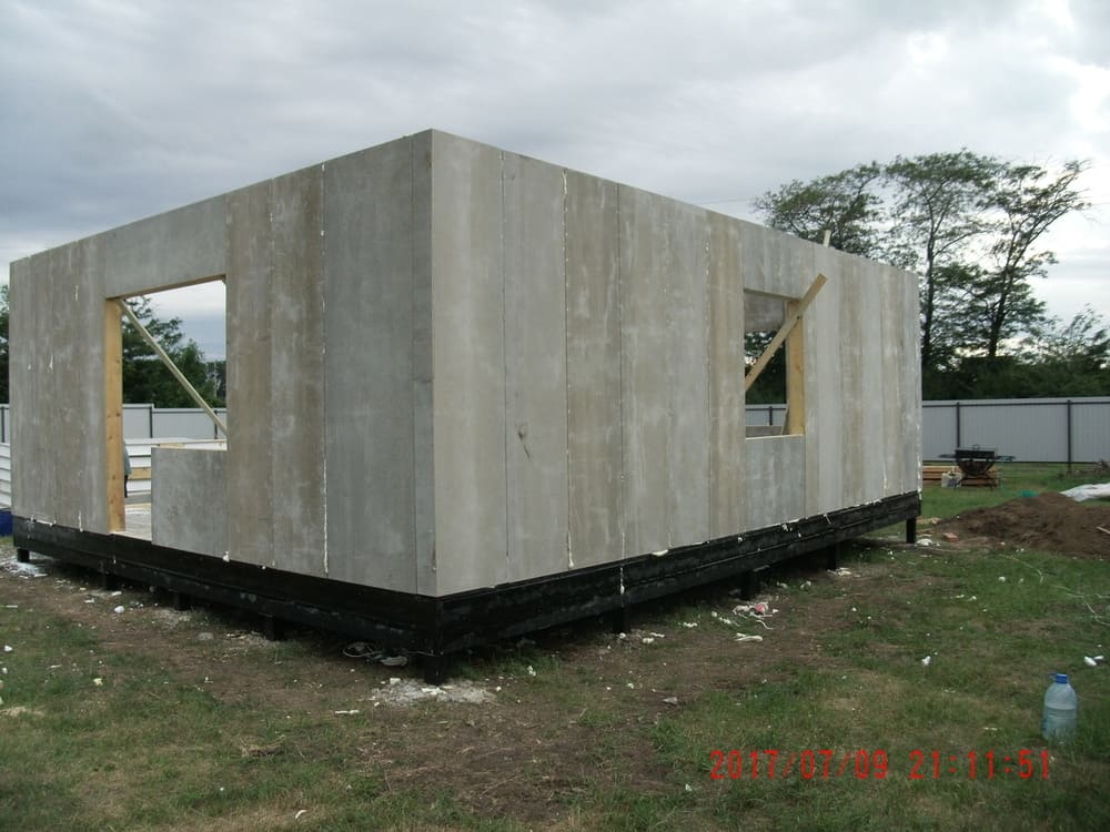 из СИП панелей из ЦСП размером 2700*1200*168 мм с антисептированным калиброванным пиломатериалом камерной сушки (46*140 мм). Монтаж каркасов несущих перегородок из пиломатериала 38*89 мм (76*89 мм).