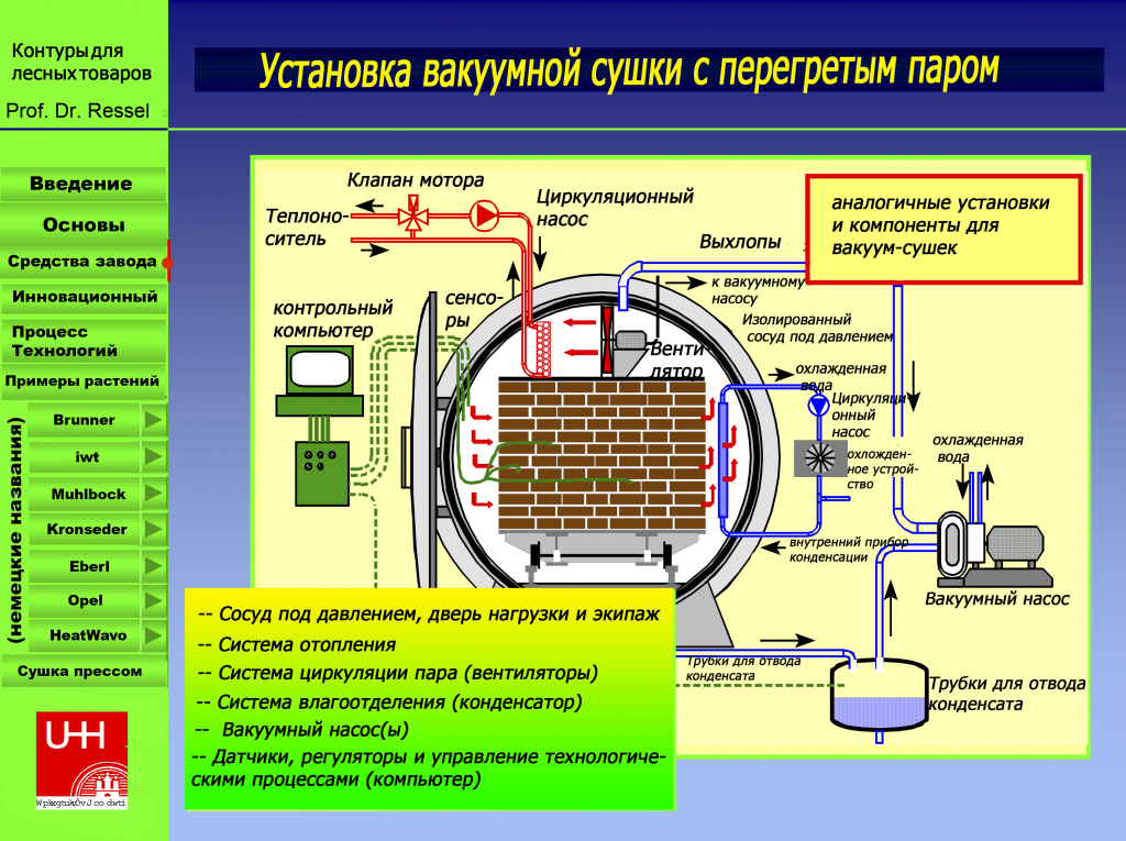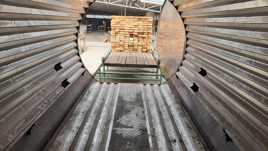 Сушка древесины в вакуумных сушильных камерах — предполагает создание пониженного давления в камере, загруженной штабелями пиломатериала. Влага, которая находится в виде насыщенного пара над поверхностью древесины, удаляется совместно с сушильным агентом. Роль последнего выполняет воздух, который в небольшом количестве подается в камеру.